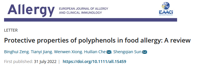 近日,太阳成tyc7111cc孙盛千副教授联合中国农业大学车慧莲教授团队在国际著名顶级期刊《Allergy》(中科院SCI一区TOP,IF=14.71)发表了题为“Protective properties of polyphenols in food allergy: A review”的综述论文。这是公司首次在《Allergy》上发表论文,代表公司在食品与生物工程领域取得的一项高水平研究成果。