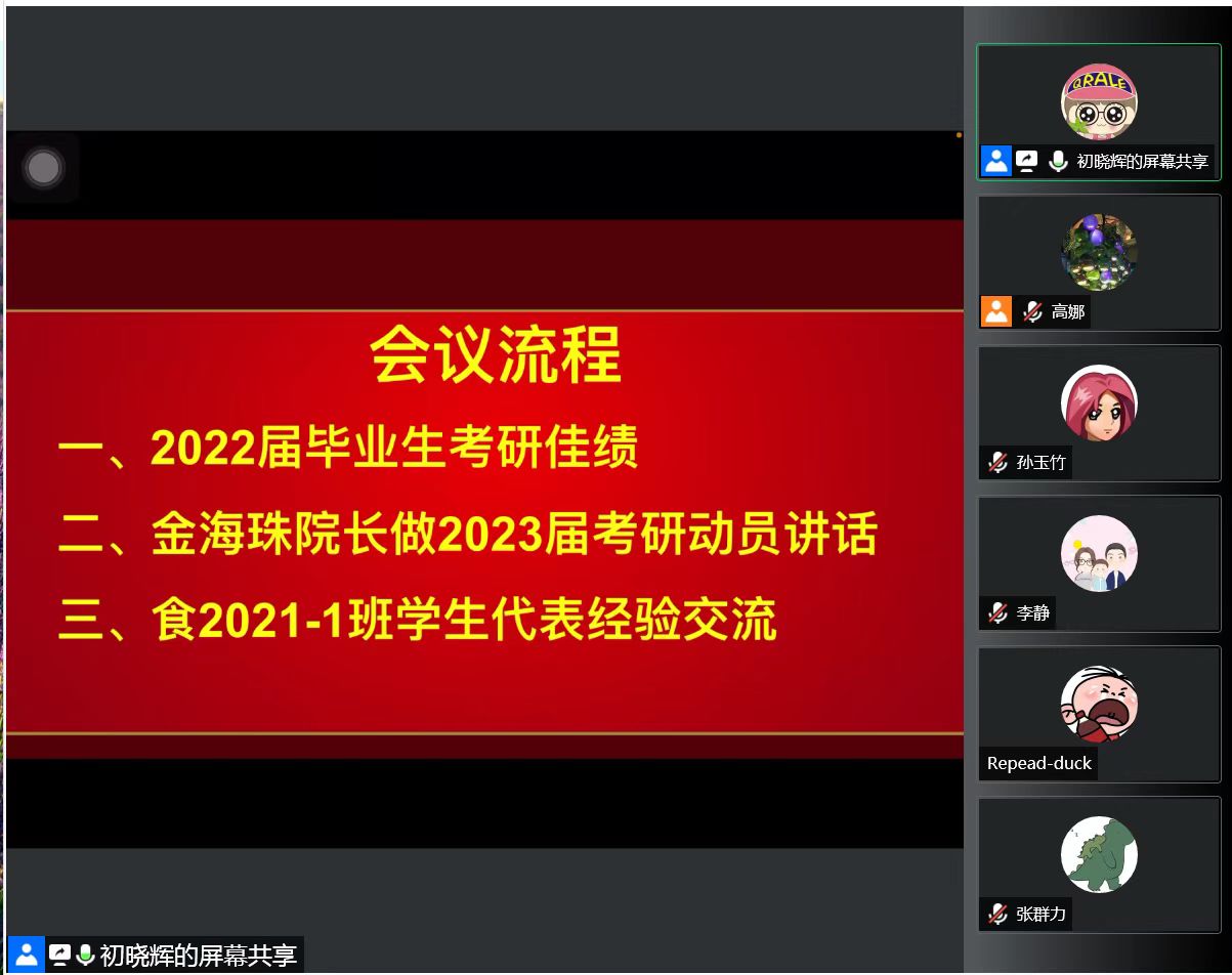 2022届毕业生考研已经落下帷幕,食品学子一如既往交出了令人满意的答卷。太阳成tyc7111cc自2020年招收第一届专升本以来,高度重视专升本员工的学习,于4月28日线上召开了2022年考研交流会暨专升本专场考研动员大会,经理金海珠,副经理高娜,专升本班主任秦红玉、韩明月,任课教师初晓辉、赵蕾、李静出席此次会议,食2021-1班3名考研优秀学子分享了考研经验。