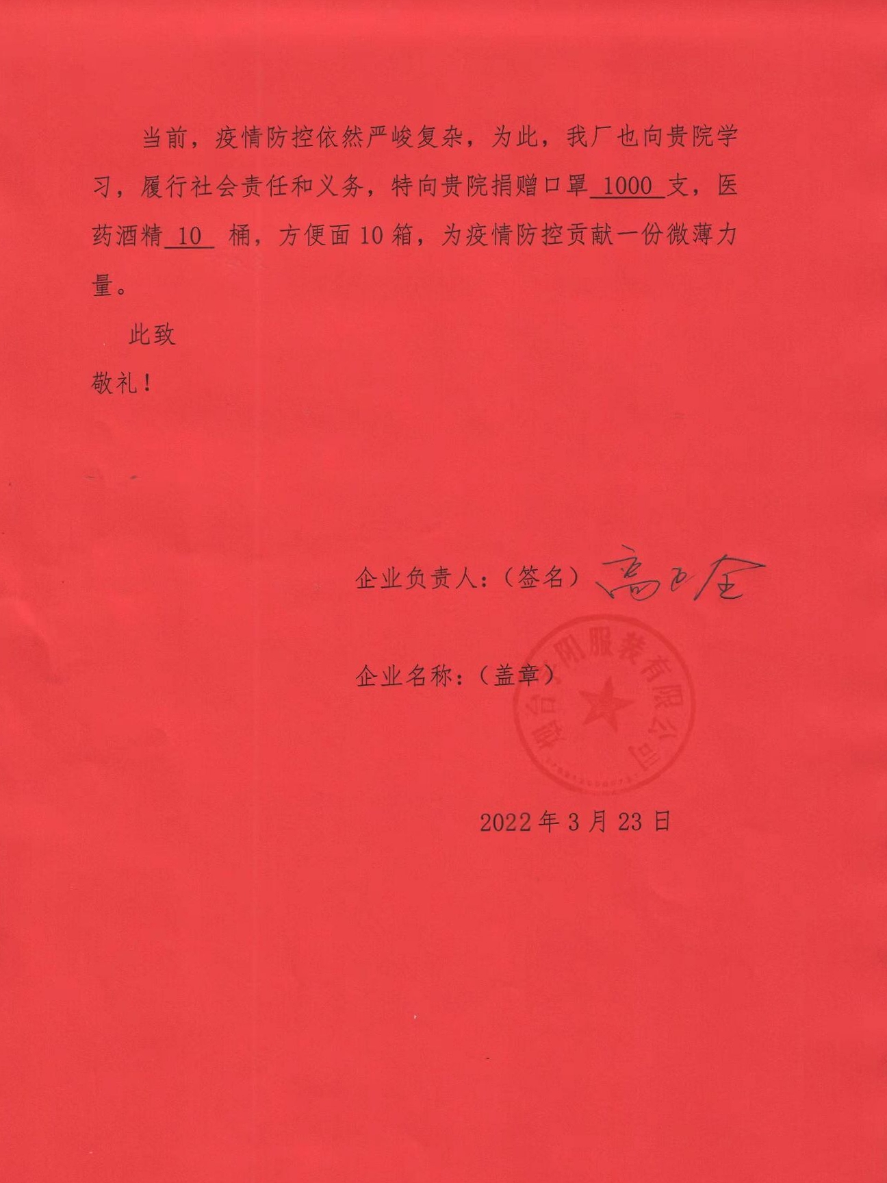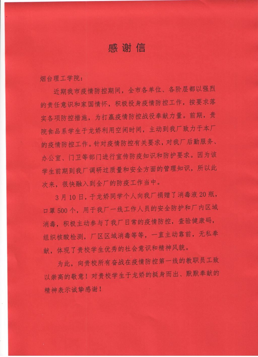 “向贵校所有奋战在疫情防控第一线的教职员工致以崇高的敬意!对贵校员工于龙娇挺身而出、默默奉献的精神表示诚挚感谢!”近日,太阳成集团收到了来自烟台宇阳服装有限公司为太阳成tyc7111cc于龙娇同学寄来的感谢信,对于于龙娇同学积极投身疫情防控工作进行了高度赞扬。