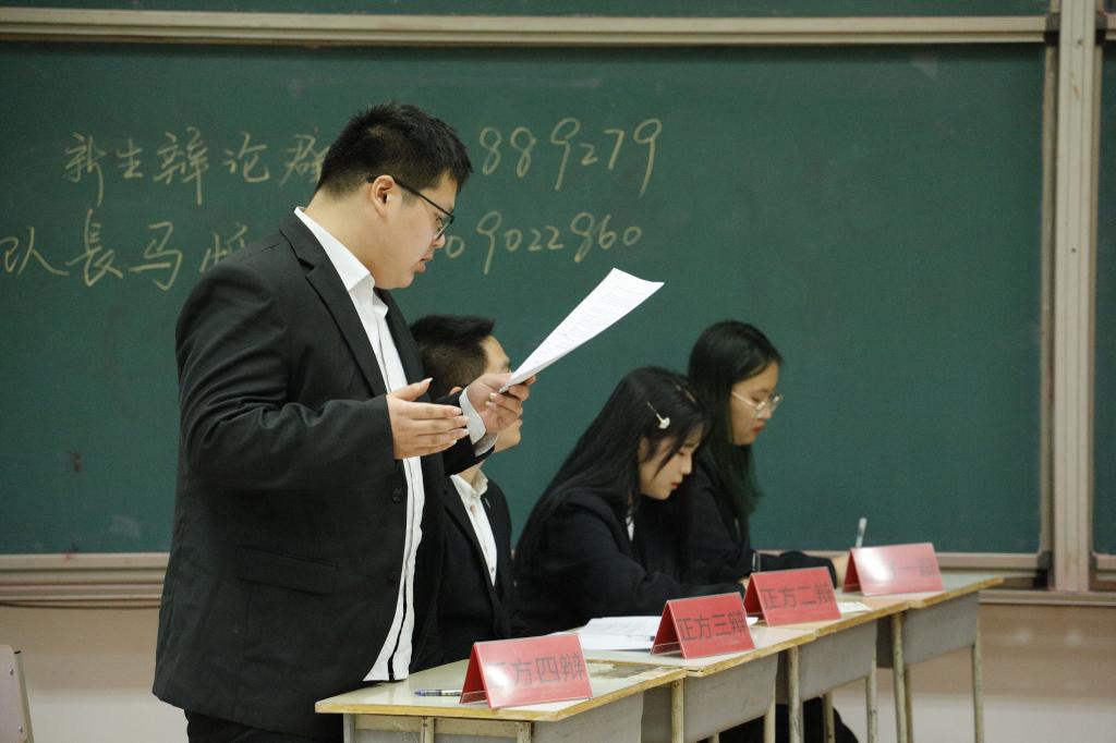 比赛开始,辩论赛主席孔楚凡向参赛队员和现场观众宣读比赛规则和辩题,正方论点为 “买买买是当代年轻人的解药”,反方论点为 “买买买是当代年轻人的毒药”。随后,八位辩手作了自我介绍,比赛正式开始。开篇立论环节,双方一辩表达自己的观点并加以论证。攻辩环节,双方选手据理力争,引经据典,反方四辩围绕着 “买买买是当代年轻人的毒药”向正方一辩提问反击,正方四辩向对反方一辩加以刁难。