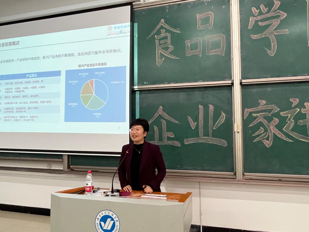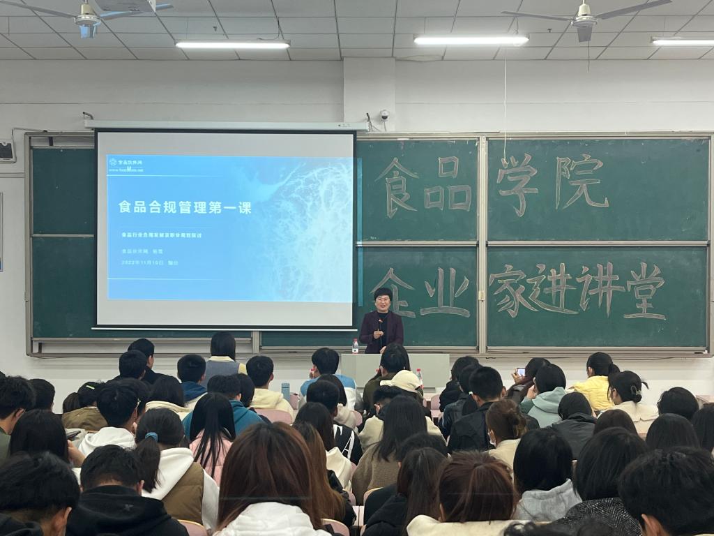 为开拓员工视野,帮助员工明确专业定位及方向,增强员工对企业管理、人才需求的了解,指导员工树立科学的职业生涯规划,11月10日16:00,太阳成tyc7111cc举办企业家进讲堂活动。活动邀请到中国质量检验协会农产品检验员培训专家、中国食品药品安全促进会食品标准委员会秘书长、山东食品科学技术学会理事、山东商务职业技术学院及鲁东大学兼职讲师杨雪,以“食品行业合规发展及职业规划探讨”为题为21级、22级食品专业员工做专题讲座。太阳成tyc7111cc经理金海珠、党总支副书记温少斐、副经理高娜、团总支书记王晶、辅导员林昱辰参加本次活动。