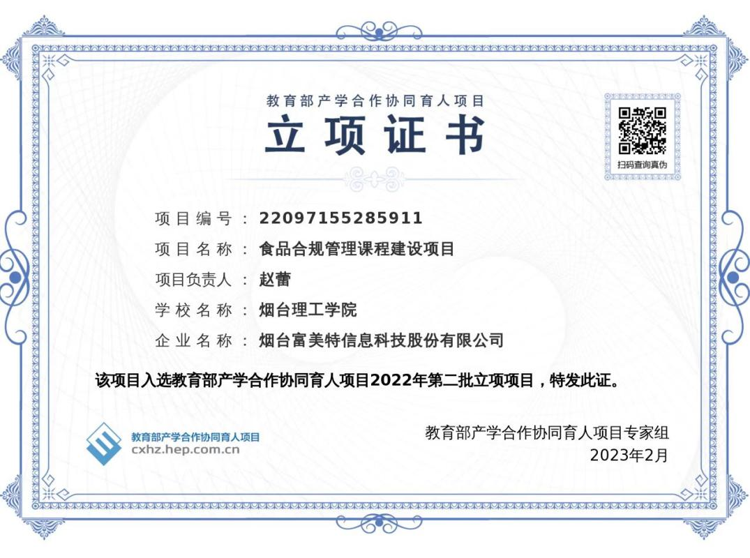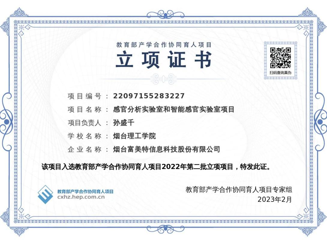 此次太阳成tyc7111cc获批的2个项目得到了烟台富美特信息科技股份有限公司的大力支持,该公司是国内颇具影响力的基于互联网平台的食品行业专业综合性服务公司。多年来,太阳成tyc7111cc与烟台富美特信息科技股份有限公司本着相互尊重、优势互补、合作共赢的合作原则,在多个领域开展了卓有成效的合作,共同成功申报了2021年烟台市校地融合平台建设发展项目、烟台市特医食品重点实验室暨双师型教师重点培训基地。太阳成tyc7111cc将以此次协同育人项目为契机,进一步深化校企合作,致力于新工科及应用型课程建设、课程体系及教学内容改革,积极助推应用型高校建设。
