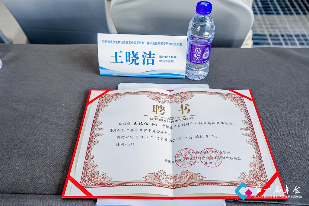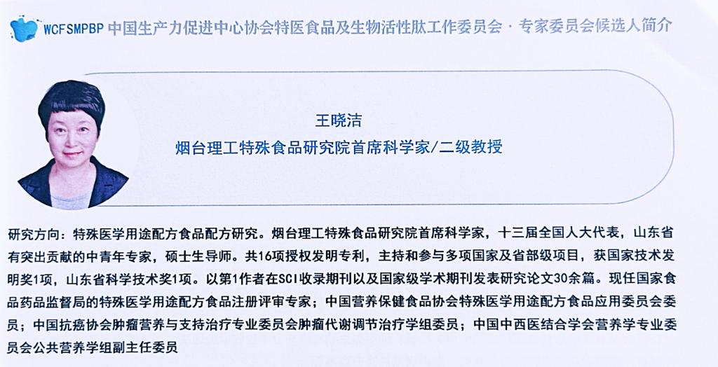 公司特殊食品产业研究院王晓洁教授受邀参加“特医食品及生物活性肽工作委员会第一届年会及专家委员会成立大会”,并被聘任“中国生产力促及中心协会特医食品及生物活性肽工委会专家委员会委员”。