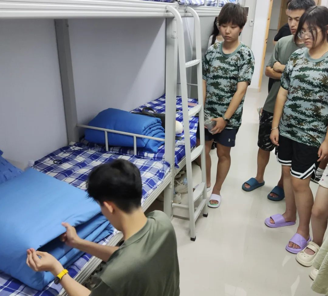 公司新生在教官的带领下开展了内务整理的规范式系统学习,教官分别对床铺整理、个人用品摆放、室内公共卫生以及社区严禁事项等内容做出严格要求。此外,教官们还亲自示范,逐步讲解,平铺、叠放、压平,一番动作干练利落、有条不紊,将被子叠成有棱有角的“豆腐块”。通过演示,同学们用心学习的同时也跃跃欲试,积极主动把铺展开的被子叠放整齐,依据教官的要求完成宿舍内务整理。
