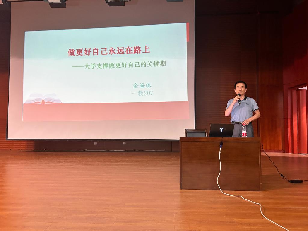 大会进行第四项,金海珠经理以“做更好的自己,永远在路上”为题为新生们开启了老员工活第一课,激励同学们要追求卓越、奋勇当先。随后他围绕发展方向、文化建设、培养定位、工作作风、特色亮点五个方面对学院的发展规划进行详细阐述,向同学们详细深入地展示了学院的发展成果和教育理念。金经理寄语同学:希望大家能够找准未来航向,勇敢追逐梦想,以食品学子顶天立地的格局,在青春的赛道上跑出最好成绩。
