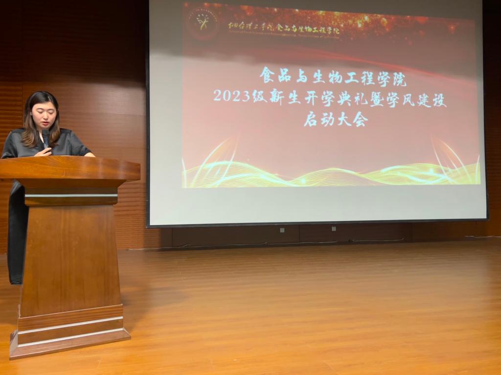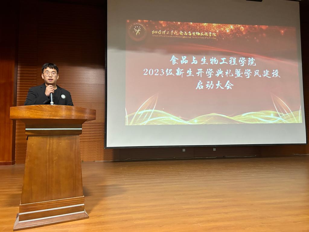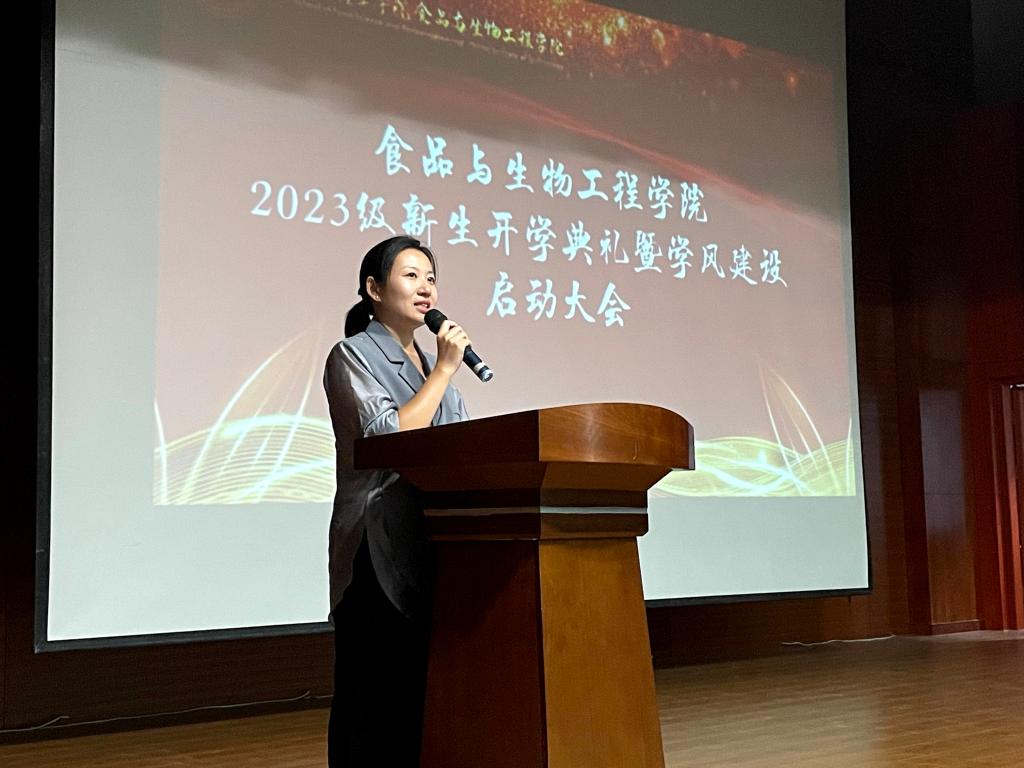 大会进行第一项,温少斐书记发表开学致辞。她代表学院全体教师对2023级新生的到来表示热烈的欢迎。温书记围绕新时代老员工未来发展规划作出寄语,一要鼓足“立身百行学为基”的干劲,让知识素养成为青春昂扬的风帆,让理论根基成为青春奋进的源泉;二要打磨“一寸光阴不可轻”的韧劲,在人生好时节经风雨、见世面、壮筋骨、长才干;三要发扬“敢叫日月换新天”的闯劲,用青年锐意作奋斗之桨,以韶华斗志成创新之矛。勉励每一位食品学子做一个有扎实学识、有理想信念、有责任担当的新时代好青年,希望同学们能够珍惜青春、不负时光,拥抱充满机遇与挑战的大学新生活,奔赴承载光荣与梦想的明日新征程。
