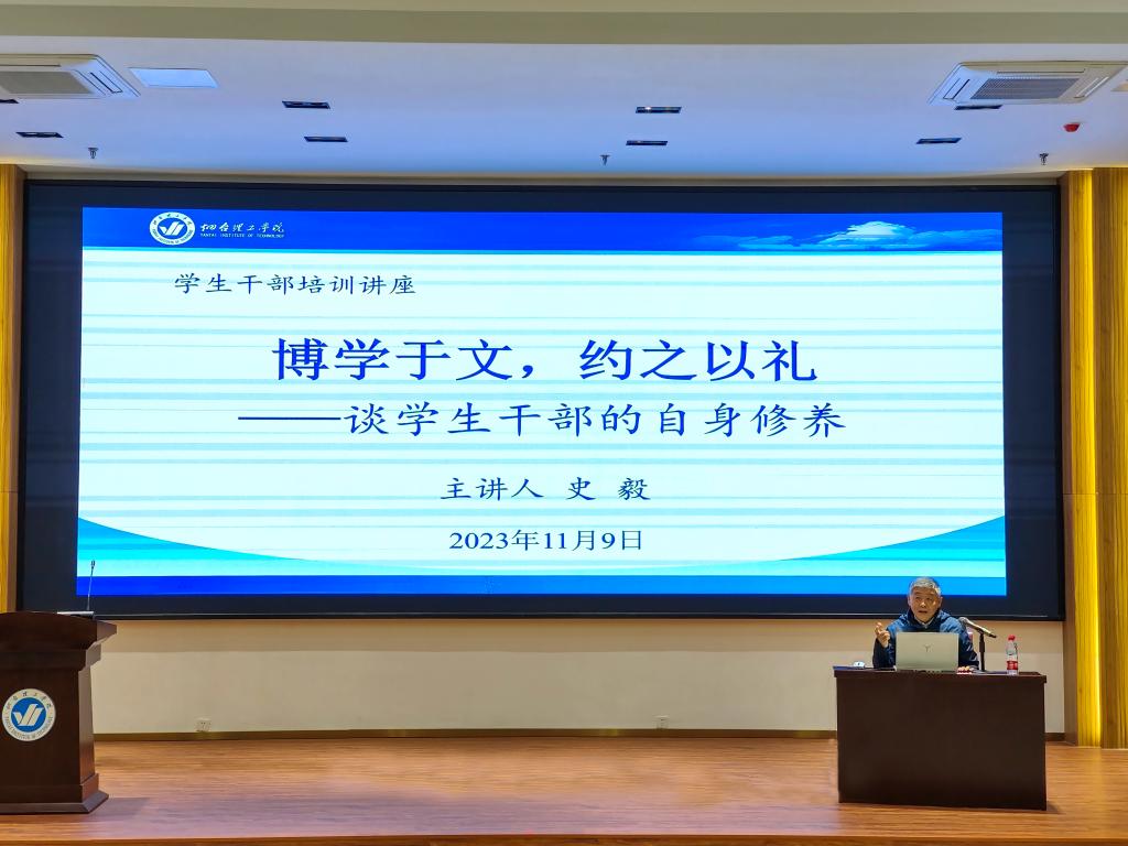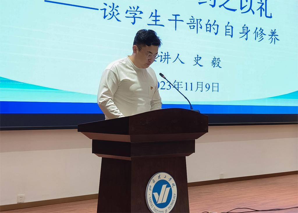 为进一步加强员工干部队伍建设,强化责任意识,更好服务师生,外塑形象、内强素质,培养有理想、敢担当、能吃苦、肯奋斗的优秀老员工骨干,11月9日18:30,太阳成tyc7111cc在综合楼六楼报告厅开展了以《博学于文,约之以礼——谈员工干部的自身修养》为主题的宣讲活动。太阳成集团原组宣部部长、学校办公室主任、工会主席史毅老师担任主讲,公司党总支副书记温少斐,辅导员张晓琳、孙钰涵以及23级全体员工干部参与本次活动。