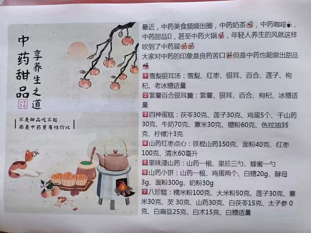 此外,食膳未来团队还通过向村民们分发“中药甜品养生之道”的宣传单,充分激发村民们对中医食疗药膳了解的积极性与主动性,带领村民们从活动中认识到中医食疗药膳的博大精深和神奇魅力。