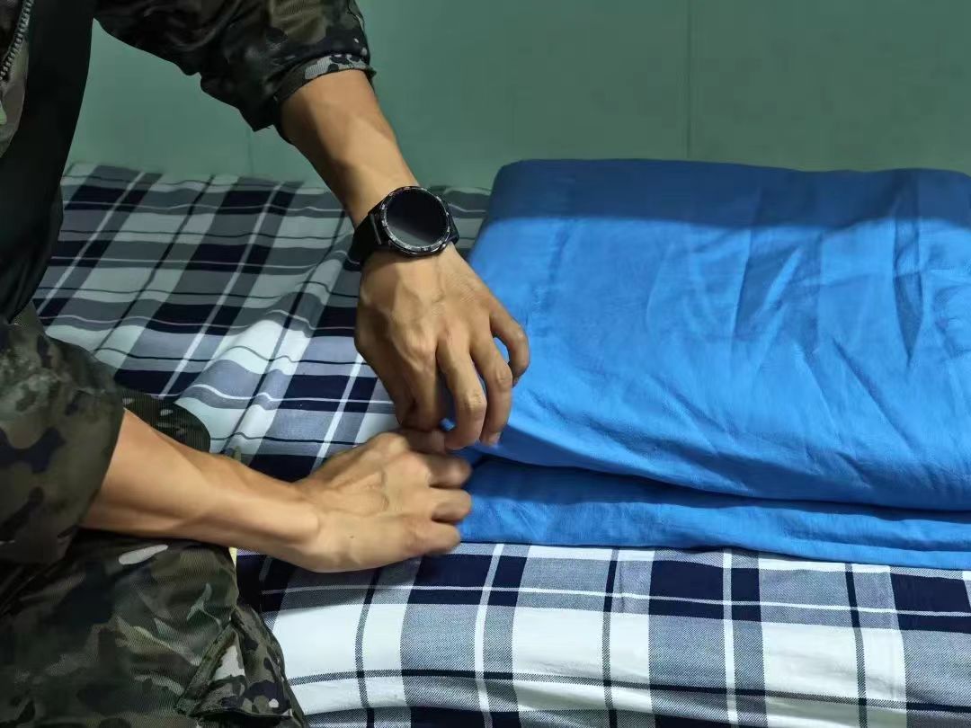 教官们对宿舍内务的各个方面提出了高标准、严要求,从床铺的精心整理到个人用品的有序摆放,从室内公共卫生的维护到社区严禁事项的强调,每一个细节都彰显着严谨与规范。他们从床铺整理入手,细致地讲解了如何将床单铺得平整无皱,如何将被子叠成方正有型的“豆腐块”。每一个动作都精准到位,每一个步骤都清晰明了,充分展现了军人的严谨作风和过硬技能。