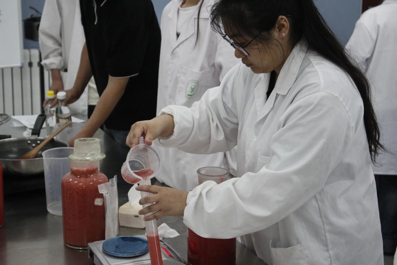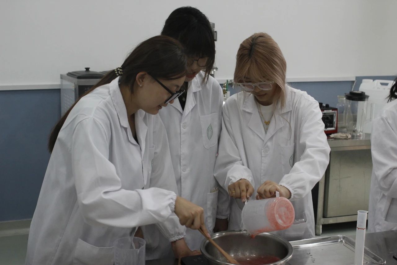 比赛正式开始,同学们热情高涨,各参赛小组迅速明确分工,有人专注原料精确配比,有人负责糖浆熬煮把控火候,有人精心构思糖果造型设计。比赛过程中,蒋鹏林经理穿梭于各小组之间,悉心指导,及时解答同学们的疑问。在同学们的紧密协作与老师们的专业指导下,独具特色的果胶果汁糖陆续产出。同学们积极交流经验、分享创意灵感,充分展现出食品学子扎实的实践能力、活跃的创新思维与强大的团队凝聚力。