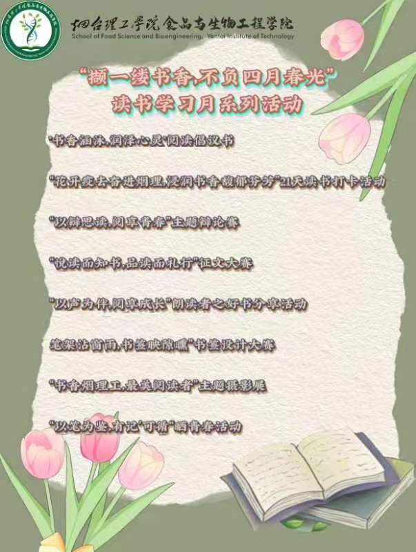 在和风煦煦的春日里,读书学习月系列活动已然拉开帷幕。读书学习月系列活动包括“书香涵泳,润泽心灵”阅读倡议书、“花开疫去奋进烟理,浸润书香馥郁芬芳”21天读书打卡活动、“以辩思读,阅享青春”主题辩论赛、“悦读而知书,品读而礼行”征文大赛、“以声为伴,阅享成长”朗读者之好书分享活动、“笔架沾窗雨,书签映隙曛”书签设计大赛、“书香烟理工,最美阅读者”主题摄影展和“以笔为鉴,有‘记’可循”晒青春等内容丰富、形式多样的主题活动。读书学习月系列活动自启动以来,得到了广大师生的积极支持与热烈响应,大家以书为伴、以书为媒、以书会友,徜徉书海、广读博取、放飞思绪,成功开启认识自我、拓宽思维、打开视野的大门。