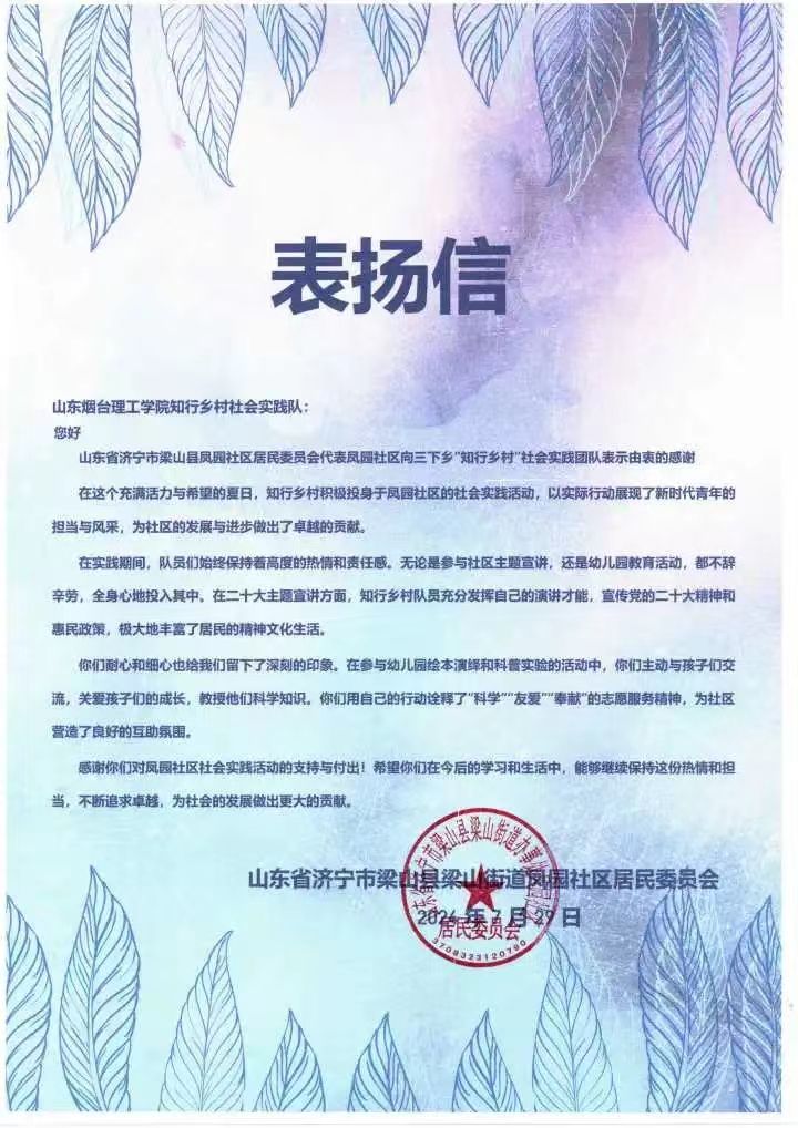这封赞扬信不仅是对实践队的肯定,更是对广大青年的激励。收到表扬信后“知行乡村”社会实践团队的队员们表示,他们将继续发扬奉献精神,不断提升自己,为社会做出更多的贡献。