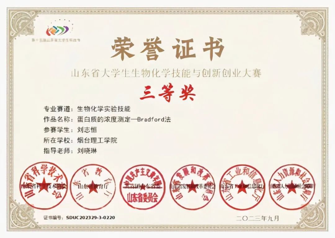 所获荣誉:大学英语六级;山东省生物化学创新大赛三等奖;优秀员工二等奖;普通话二乙证书;院级优秀共青团员。