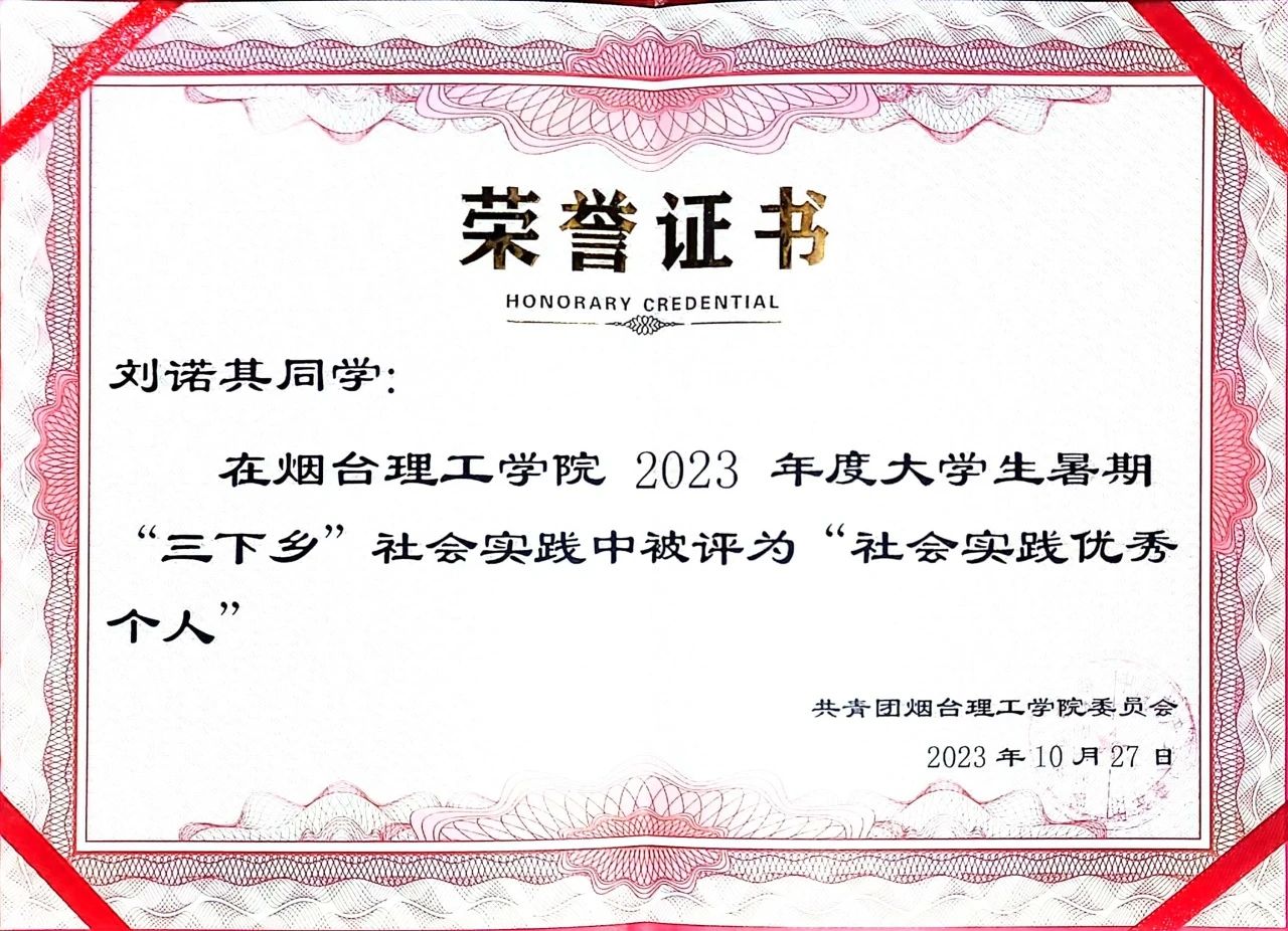 作为一名共青团员和入党积极分子,刘诺其始终牢记为人民服务的宗旨,积极向党组织靠拢。在校期间,她投身于社会实践当中,利用课余时间向学校周围的居民科普宣传有关食管癌的知识,学习了解烟台绒绣文化并向居民进行科普宣传,这些活动不仅让她深刻体会到了为人民服务的快乐与满足,更让她对中华优秀传统文化有了更深入的了解与认识,明确了作为老员工更应主动传承中华优秀传统文化,主动担当,积极作为,在实践中淬炼青春。在这一过程中,刘诺其荣获社会实践优秀个人、社会实践红旗团队、优秀青年志愿者、社会实践优秀团队实践报告等奖项,并向国家级媒体投稿多篇。