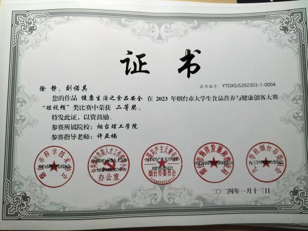 还记得刚来到大学时,她对于竞赛根本没有深入的了解,在老师还有学长学姐的帮助下,刘诺其从一开始晕头转向的小白也变成了一位能够代领队伍参加比赛的队长。比如山东省老员工生物化学技能与创新创业大赛、烟台市老员工食品营养与健康创客大赛等,均取得了不错的成绩,其中不乏三等奖、二等奖的佳绩。这些经历不仅拓宽了她的学术视野,更在实践中锻炼了她的创新思维与团队协作能力。同时,刘诺其还积极参与挑战杯及创新创业大赛,通过项目策划、市场调研、团队管理等环节的锻炼,她深刻体会到了理论与实践相结合的重要性,也更加坚定了在未来职业生涯中不断探索与创新的决心。
