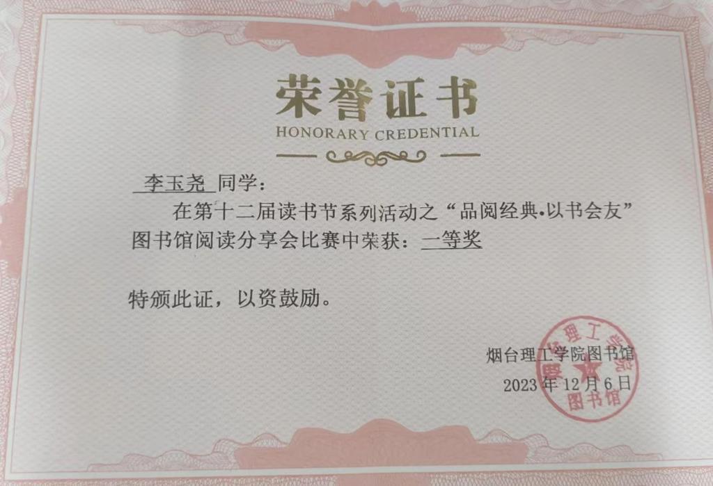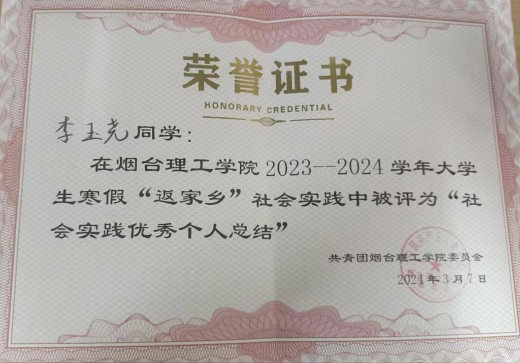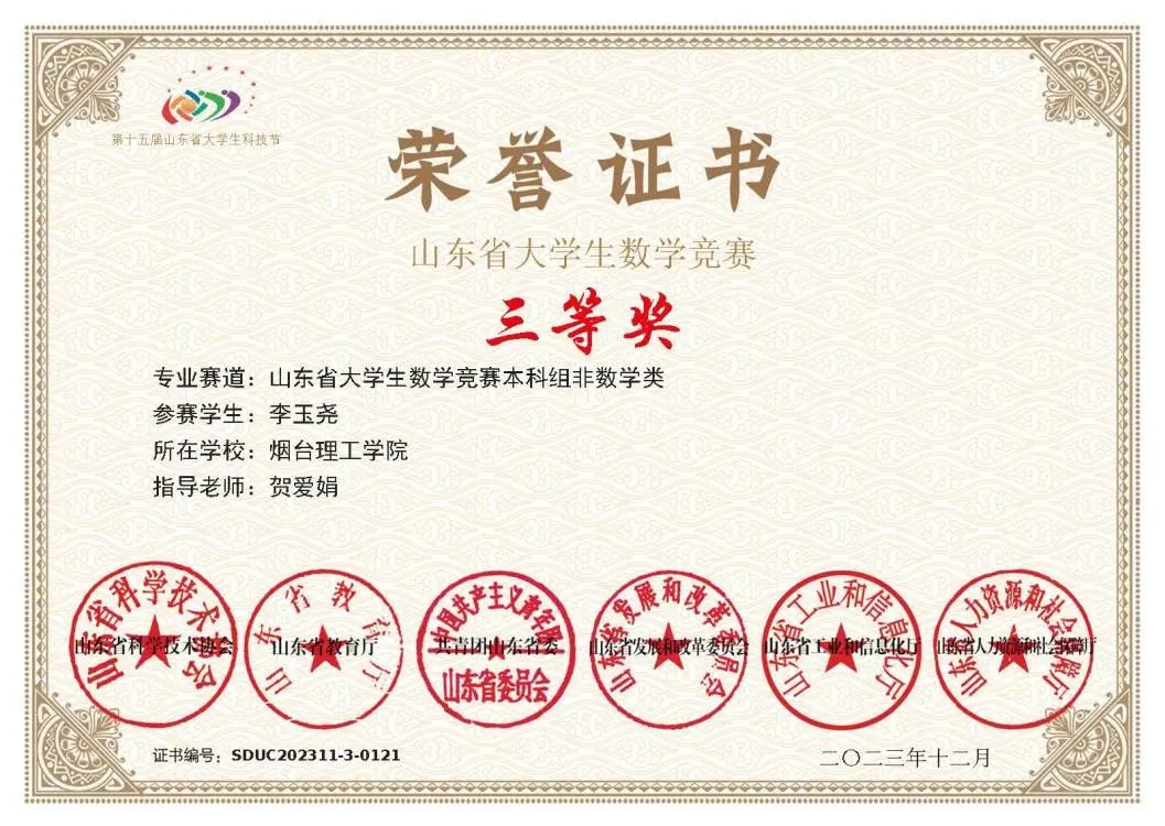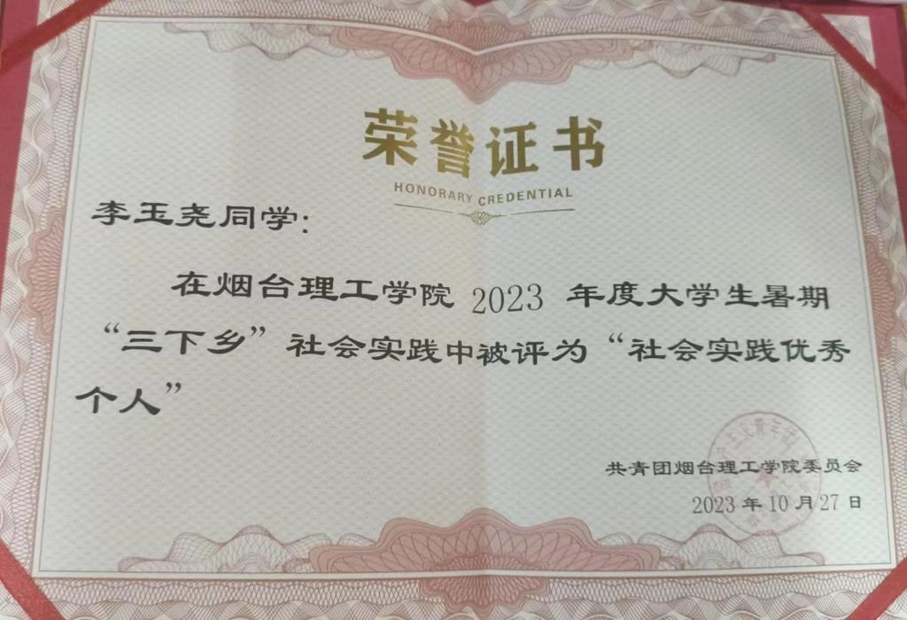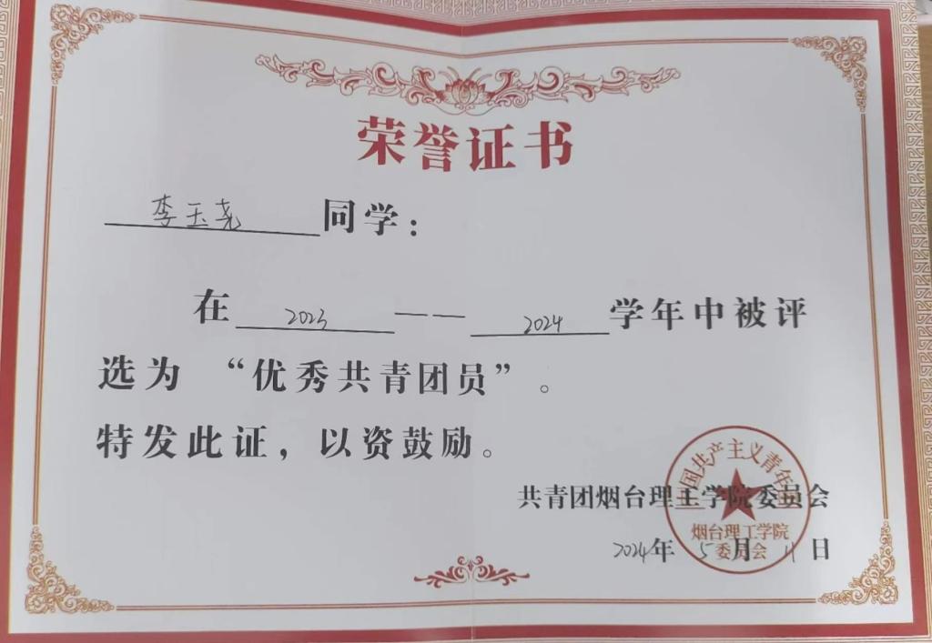 人生在勤,不索何获。进入大学以来,李玉尧以优秀的学长学姐为榜样,从他们身上学习丰富的经验、汲取笃行的力量,她深知唯有勤奋才是成功的路径,经过三年的探索和坚持,李玉尧找到了适合自己的学习方法,保持着良好的学习习惯,秉持着勤勉向学的学习态度,对自己的学习进行合理的规划。最终,本学年获得了专业第一的好成绩,并一次性通过了英语四级、计算机二级。李玉尧不仅在专业课程学习上取得了优异成绩,同时,她还积极参加各类比赛与科研项目,屡获佳绩,曾获得全国老员工数学竞赛省三等奖、山东省科普创作大赛二等奖等荣誉。李玉尧用自己的实际行动证明了努力的价值,发挥着榜样的引领作用,展现出新时代老员工踔厉奋发、多元发展的青春风貌。