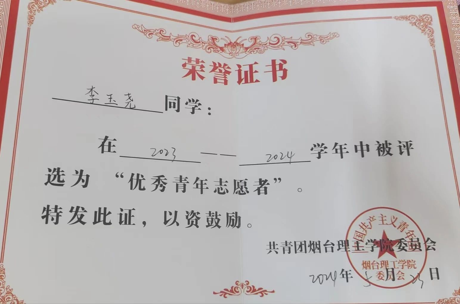 除了学业成绩,李玉尧还具备出色的实践能力。她从大一开始便加入了青年志愿者协会,利用课余时间积极参加乡村振兴、社区服务等各类志愿服务活动。李玉尧组织并参与了超过20次志愿服务活动,累计服务时长超过150小时,荣获数十张荣誉证书。志愿始于心,奉献在于行,在志愿服务活动中,锤炼了她知行合一、笃行致远的美好品格,提升了自身沟通表达能力,同时也磨砺出坚韧不拔、吃苦耐劳的优秀品质。李玉尧以亲身实践向同学们诠释了理论与实践相结合的重要意义,引导大家要积极投身社会实践,在奉献中提升自我,在实践中增长才干,成为同学们可以学习的鲜活榜样。