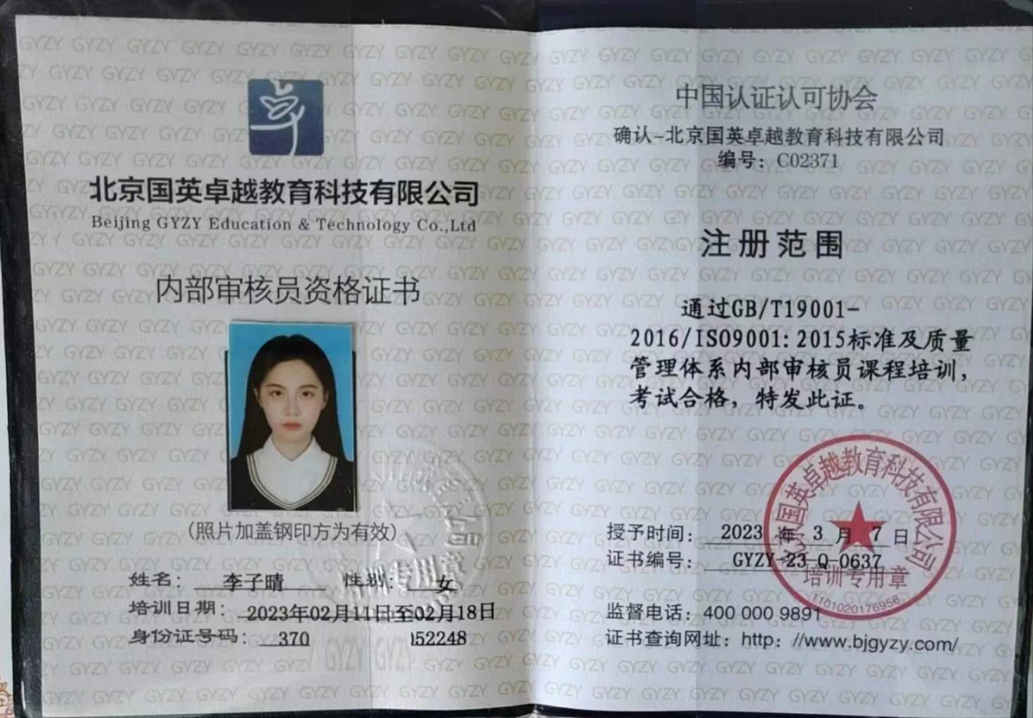 课程学习之余,她也注重专业知识实践运用,积极参加各项竞赛、考试,顺利通过英语四级,通过IS022000:2018标准及食品安全管理体系内部审核员、GB/T19001-2016/IS09001:2015标准及质量管理体系内部审核员。当然,李子晴也不止步于现有的成绩,未来,她将以谦逊的态度不断努力学习,扎实基础,争取取得更优异的成绩,李子晴坚信那些看似不起波澜的日复一日,会突然在某一天,让人看到坚持的意义。