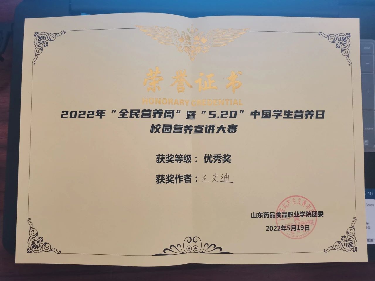 8.“全民营养周”暨“5.20”中国员工营养日校园营养宣讲大赛优秀奖