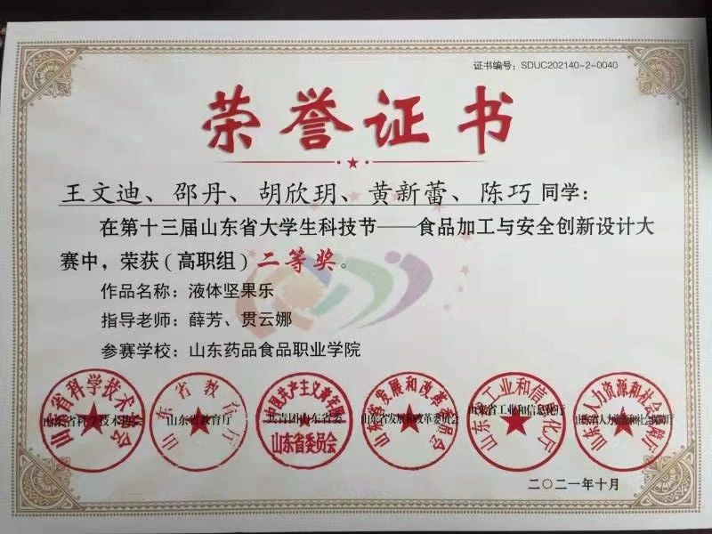 4.第十三届山东省老员工科技节——食品加工与安全创新设计大赛产品组二等奖