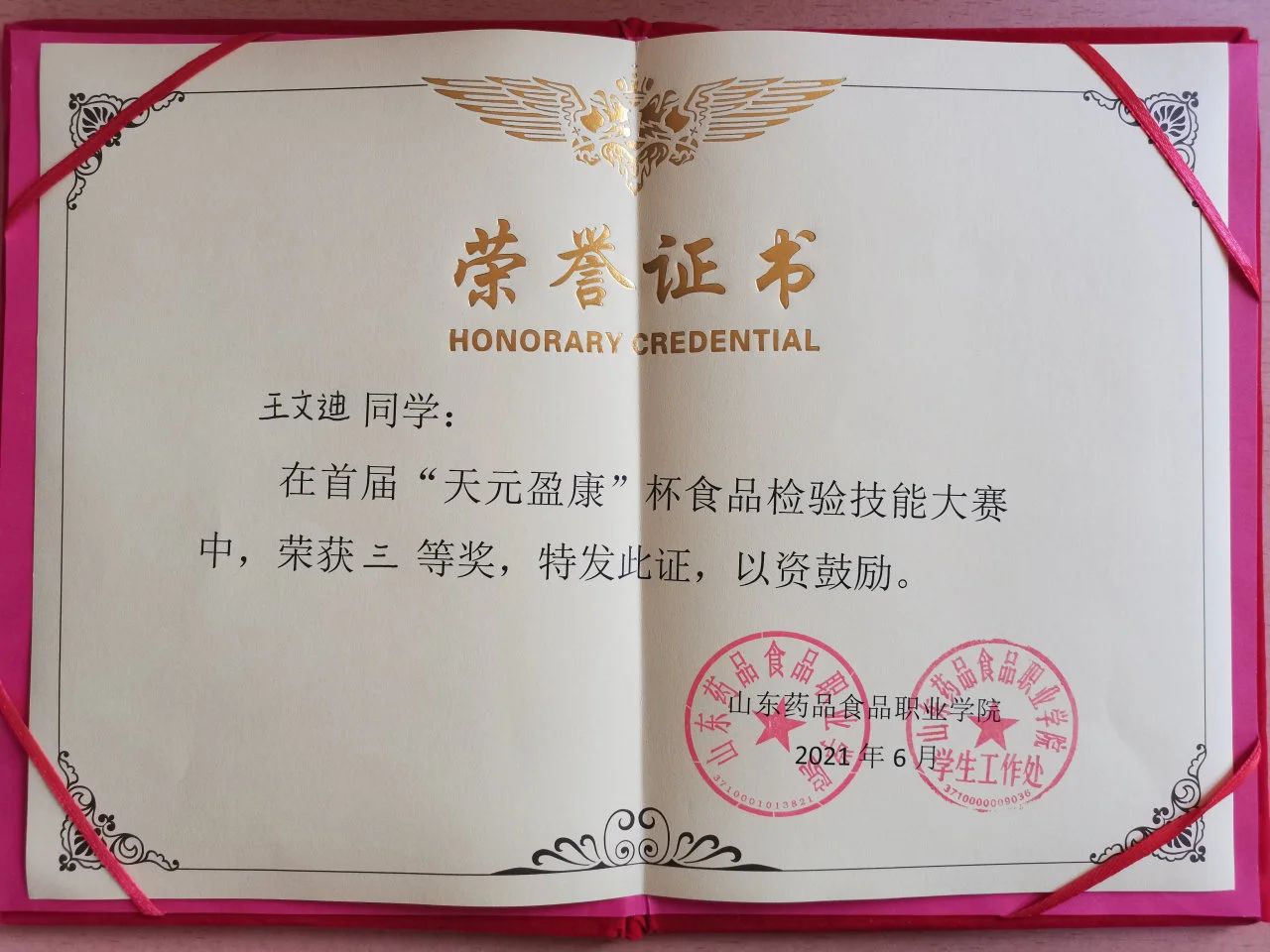 2.首届“天元盈康”杯食品检验技能大赛三等奖