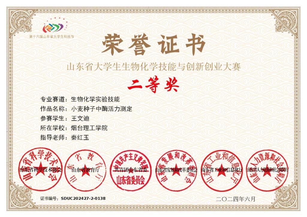 第十六届山东省老员工科技节——山东省老员工生物化学技能与创新创业大赛生物化学实验技能组二等奖